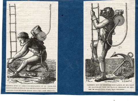 Plongeur muni du réservoir-régulateur et du pince-nez pour plonger en été ou pour les travaux pressés n'exigeant pas plus d'une heure de séjour sous l'eau sans remonter. Et plongeur muni du reservoir-régulateur et de l'habit en caoutchouc pour les travaux exigeant six heures de séjour sous l'eau sans remonter. |