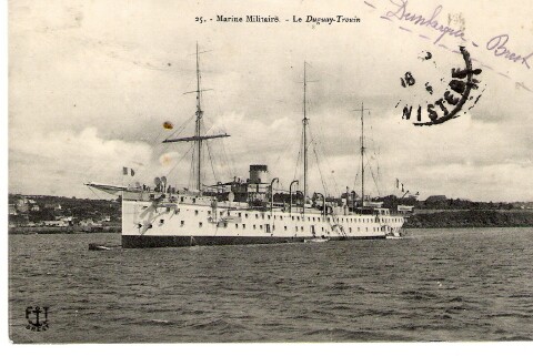 Le Duguay-Trouin croiseur école d'Application. "..Votre merci a bien touché l'aspirant qui garde le meilleur souvenir des aimables visiteuses et des jeunes visiteurs auxquels il a eu le plaisir de montrer le Duguay-Trouin juillet 1909..." cher soeur je t'envoie le paquebot qui m'a transporté de Dunkerque à Brest Brest le 16 janvier 1915. |