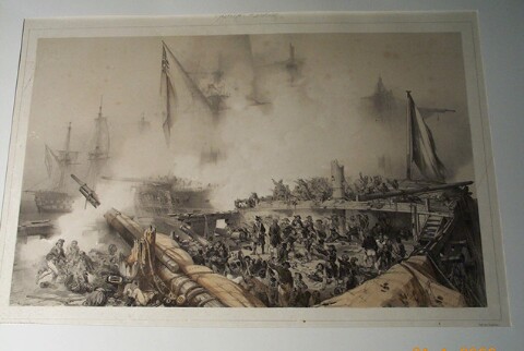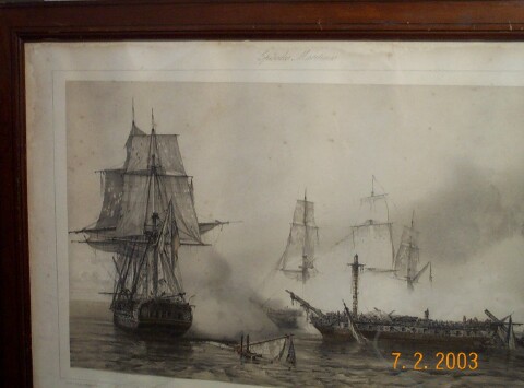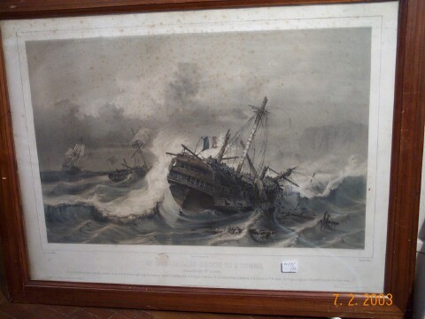 Le Tonnant au combat d'Aboukir 1 août 1798. Ce vaisseau de 80 canons commandé par l'intrépide Aubert du Petit-Thouars se trouve à la fin de ce combat mémorable... estimation de vente220 euros encadrée |