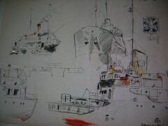 de bâteaux, crayon de papier et rehaut de rouge,