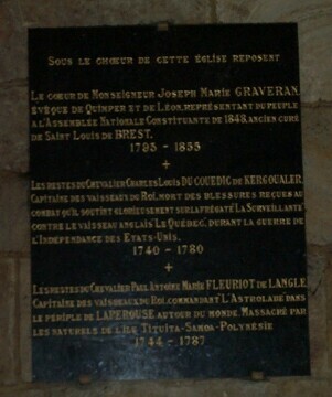 Tombeau de DU COUEDIC, dans l'église Saint Louis à Brest, détruit et profané par les patriotes les bronzes en furent enlevés,le marbre réduit en miettes et le cercueil vidé,la fatigue seule fit cesser le pillage et tout se termina par une immense orgie et un spectacle gratuit offert par la ville,et toute la nuit on fèta dignement la RAISON dans les cabarets et les tripots de Brest. (aux frais du roi).. |
