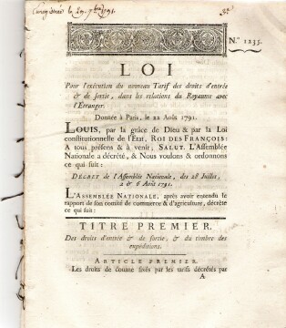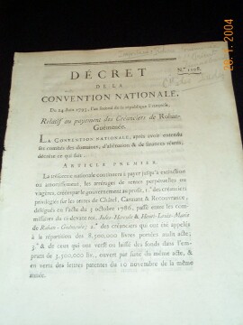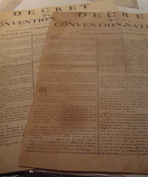 L'ACTE DE NAVIGATION) - «Décret de la Convention Nationale, du 27e jour du premier mois de l'an 2 (18 oct. 1793), contenant des dispositions relatives à l'Acte de Navigation.» - «La Convention Nationale, après avoir entendu le rapport de la Commission des Douanes, décrète ce qui suit; (en 40 articles): 1°) La laine non ouvrée d'Espagne ou d'Angleterre, la Soie brute, des espèces d'or ou d'argent, la cochenille, l'indigo, les bijoux d'or ou d'argent, dont la matière vaut au moins trois fois le prix de la main d'oeuvre, & accessoires, ne sont pas compris dans la prohibition d'importation indirecte décrété par l'Acte de navigation. 2°) En temps de Guerre, les Bâtiments Français ou neutres peuvent importer indirectement d'un port neutre ou ennemi, les denrées ou marchandises de pays ennemi, s'il n'y a pas de prohibition générale ou partielle des denrées & marchandises du pays ennemi. 3°) en temps de Paix ou de Guerre, les Bâtiments Français ou étrangers frétés pour le compte de la République, sont exceptés de l'acte de navigation...» - Impr. à BOURG (AIN), de l'Imprimerie de Philippon & Compagnie - Placard en deux feuilles (46 x 39) prix 390 euros |