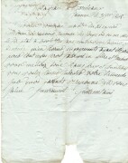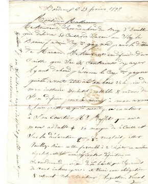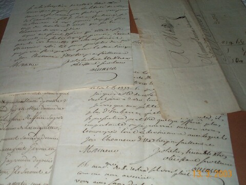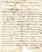 SAINT DOMINGUE. 3 lettres de 1795 à 1853. 20 pages Dossier relatif à la réquisition du navire "L' Eulalie" par le général Lavaux ,gouverneur de Saint Domingue en janvier 1794 pour les besoins de l'armée du nord. Les marchandises furent prises le navire affrété pour transporter 400 hommes de troupe en divers points de la colonie puis dépouillé,pour équiper la goelette "La Pourvoyeuse" et la corvette "La Mayenne" 1795-1796. Pétitions de Simon GASSIES négociant et armateur Bordelais détaillant les dommages subis et chiffrant ses pertes 2 mars 1853 pétition de ses descendant à Napoléon III demandant une transaction ou une récompense nationale pour l'immense service que notre père a rendu à l'armée coloniale..... Prix de vente du dossier: 350 euros |