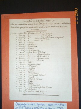 Notes des marchandises arrivées de l'Inde sur le vaisseau Victor Amedee dont les détails et époque des ventes à Nice chez J.B.Guide seront successivement........................ |