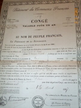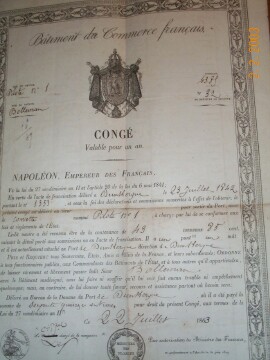 Acte de francisation du trois-mâts "MARGUERITE" de Bordeaux parchemin époque second Empire trois mâts 34 mêtres de long, 265 tx 1862 Prix 220 euros. |
