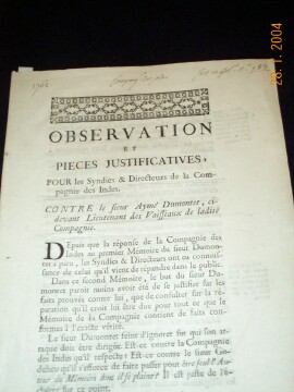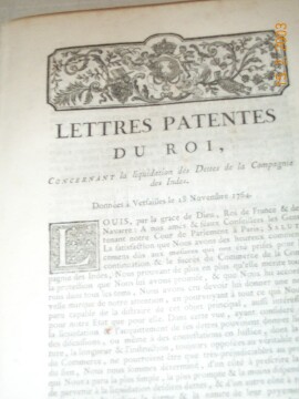 2009. monsieur , Pour compléter votre page, veuillez trouver ci-jointe la photographie du décret officialisant la création de la compagnie des Indes orientales par Colbert. : Déclarations du Roy L'une ,portant establissement d'une Compagnie pour le Commerce des Indes Orientales L'autre en faveur des officiers de son Conseil & cours souveraines interessées en ladite compagnie & celle des Indes Occidentales.