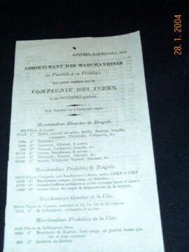 Blanche de Bengale. 2oo pièces de Casses Baftas assortis en sortes Berilly, Bourom,Jougdia Luckipore,Chittibully,Callapattis &c Marchandises prohibées de Bengale. Choppahs soit Bandannoes à fleurs Bandannoes rouges jeaunes et chocolats. Romals SutRom ordinaires à petit carreaux Sannas bleux 20 verges de longueur Marchandises blanches de la Côte. 29510 pièces de Guinées assorties en 14,15, conjons Marchandises prohibées de la Côte. 9522 Pièces de Sallamporis 4880 Pièces Mouchoirs de Madras ,fond rouge. Soyeries de la Chine. 640 pièces brochées à petit objets diverses couleurs Nanquins en Privilège. |