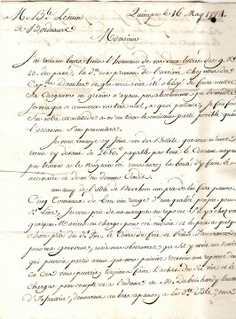 Messieurs Pour reponse a la lettre que vous m'avez fait l'honneur de m'écrire le 30 du passé ,a l'arrivée du Navire l'Union de Ciboure qui s'attend ici en peu je previendrai l'armateur des ordres que vous me donné messieur de retirer les marchandises que monsieur Arnaud de la Martinique y aura chargé je ne manquerai pas de l'informer de l'arrivée de ce batiment. J'ai apris Messieurs que vous aviez vendue votre morues un bon prix eût égard a ce qu'elle vaut ici,ce qui m'a fait un vrai plaisir et vous avez bien fait de vendre ce poisson chez vous plutot que de l'envoyer ici. ................ ................ Les caffés qui montèrent subitement il y a environ un mois ont rebaissés d'un sou a 18 . cette hausse ne dura que qques jours et j'en proffitai qq chemin de fortes parties que j'avois en magasin j'en vendis pres de 30/m de fin ........... ............ cette denrée ainsi que les autres de l'amérique resteront en calme jusqu'au mois prochain que la demande de l'Etranger et les besoins de printems prix de la lettre :50 euros.