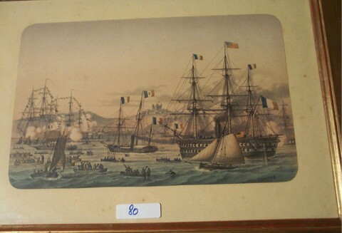 reine victoria en visite à Cherbourg 1858. Théodore Gudin. peintre officiel de la marine Crayon noir,craie blanche daté et situé en bas à gauche "Rade de Cherbourg 5 août 1858" Le salut des vaisseaux anglais et français bord à bord me rappelait malgré moi les combats d'autrefois.Puissent-ils ne pas se renouveler! " prix de vente: 1500 euros. |
