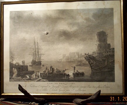 Estampe noire 0,64x0,80 m cadre bois redoré mouluré accident provenant d'une propriété du XVIII ém siécle d' Ile de France. Vue des galéres de Naples prix de vente 345 euros |